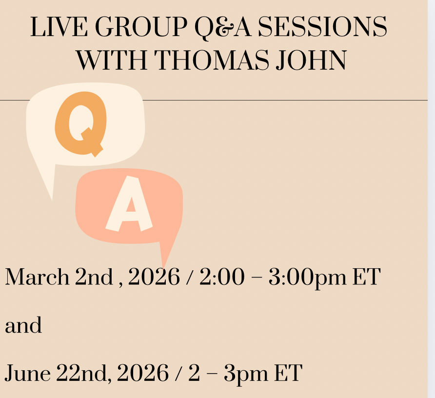 4. Live group Q&A sessions with Thomas John. Here you will be able to ask questions in regards to the class to receive additional support from Thomas and your classmates. There will be TWO  60-minute Q&A’s, which are also recorded for those unable to attend live. (2 in total)